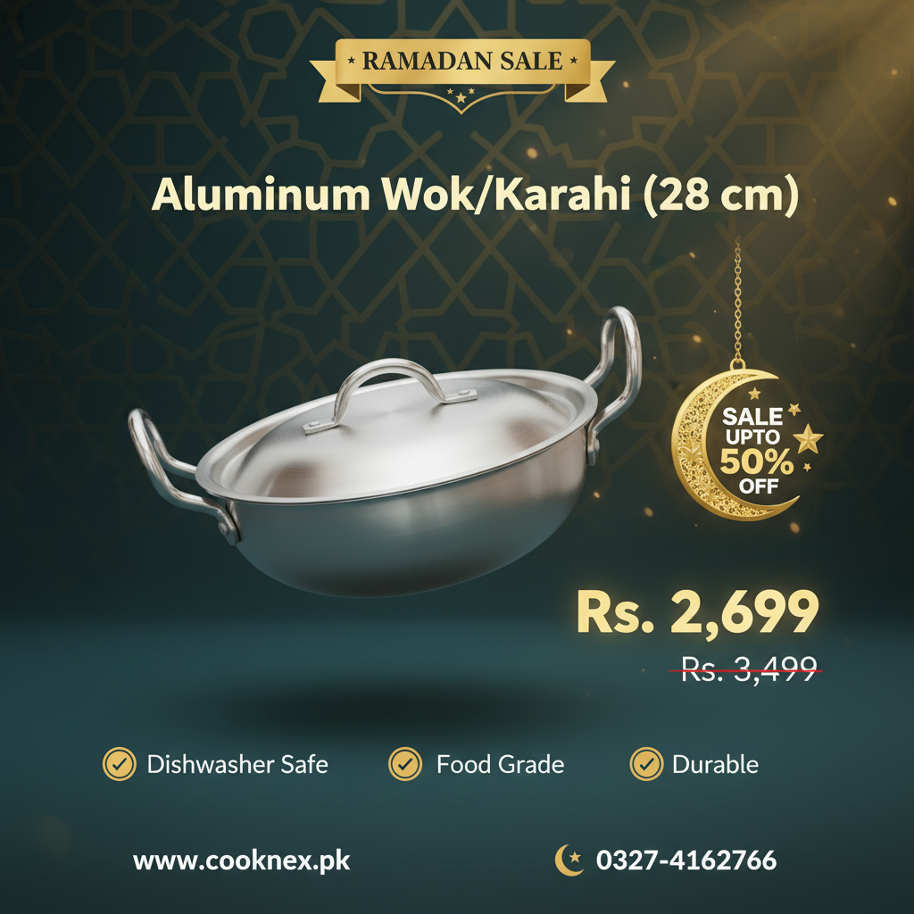 Master the art of wok cooking with this professional-grade 28 cm aluminum karahi. Engineered for even heat distribution, the lightweight aluminium construction heats quickly and responds instantly to temperature adjustments—essential for stir-frying, deep-frying, and traditional karahi preparations. The included fitted lid traps steam and moisture for braising and slow-cooking applications. Ergonomic stylish handles provide secure grip and heat management during intense cooking sessions. Versatile enough for everyday family meals or restaurant-quality results, this karahi delivers consistent performance across gas and electric stovetops.
